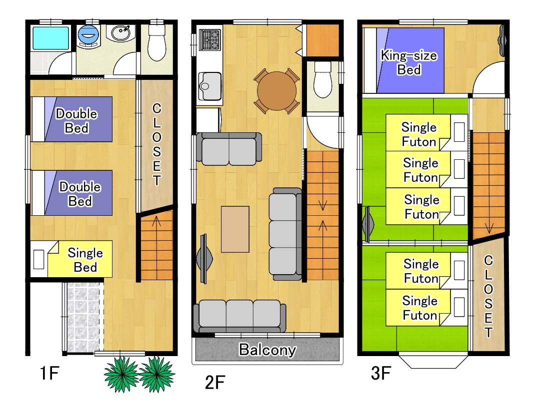1階~3階まで室内85㎡貸し切りの戸建で最大13名様のご宿泊が可能です。